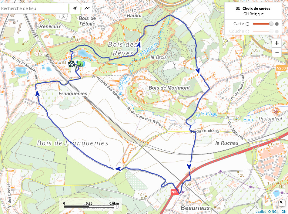 Départ, sous la houlette de Marc, sur une boucle semblable à celle mentionnée dans la rubrique gps. Monterons, à l’est, en direction de Louvain-la-Neuve avant de prendre, plein sud, la direction du quartier du Ruchaux avant de reprendre, vers l’ouest, la direction du Bois des Rêves et ainsi retrouver le parking de départ.