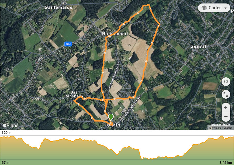Départ, sous la houlette de Nicole, vers le nord-ouest, avant de rejoindre, un peu plus à l’est, le chemin de Bas Ransbeck que nous prolongeons, vers l’est, en direction de la route de Genval (N271) avant de virer plein nord en direction des vignobles du Bois des Dames. Nous prenons alors plus au sud-ouest, la direction de Hannonsart, avant de virer plein sud, via le chemin des Champs, pour rejoindre notre parking de départ.