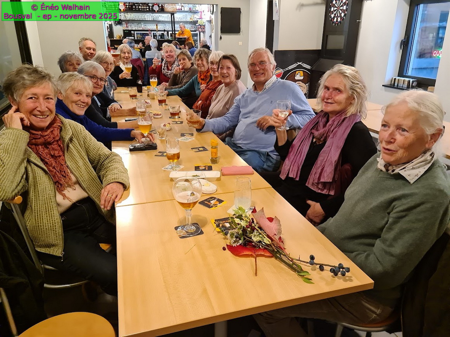 Départ, sous la houlette de Nicole, vers l’ouest, en direction de Thy. Virage pratiquement à 180°, vers l’est, pour traverser le bois de la Tassenière avant de poursuivre en campagne en direction de La Roche. Virage, au nord-ouest en direction du vignoble de Bousval et en passant en bordure du bois de la Roche à Mont et à deux pas de la ferme de la Baillerie revenir vers le Hall Omnisport Georges Gossiaux. Sa cafétéria sera l’occasion du verre de l’amitié offert par Étienne à l’occasion de son anniversaire. Merci à lui.